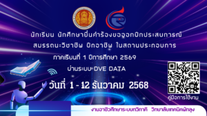 งานอาชีวศึกษาระบบทวิภาคี แจ้งนักเรียน นักศึกษายื่นคำร้องขอออกฝึกประสบการณ์สมรรถนะวิชาชีพ ฝึกอาชีพ ในสถานประกอบการ ภาคเรียนที่ 1 ปีการศึกษา 2569 ผ่านระบบ DVE DATA ระหว่างวันที่ 1-12 ธันวาคม 2568