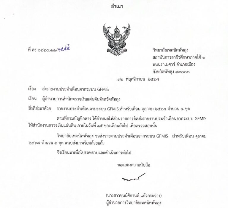 ประกาศ วิทยาลัยเทคนิคพัทลุง แจ้งหยุดเรียนกรณีพิเศษ 2 วัน ระหว่างวันที่ 20-21 พฤศจิกายน 2568
