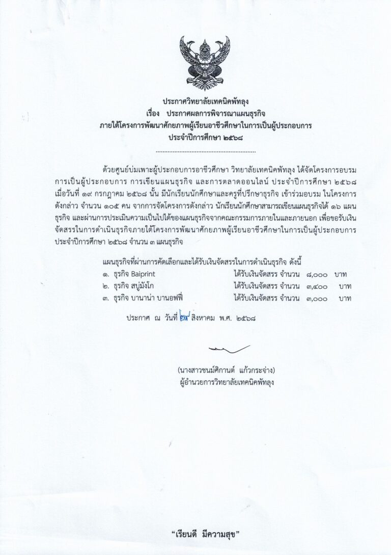 ประกาศผลการพิจารณาแผนธุรกิจ ประจำปีการศึกษา 2568
