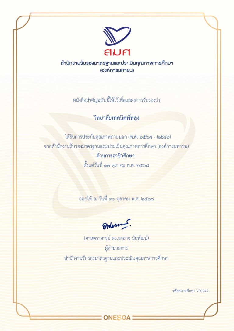 วิทยาลัยเทคนิคพัทลุง ได้รับการประกันคุณภาพภายนอก (พ.ศ. 2568 – 2572) จากสำนักงานรับรองมาตรฐานและประเมินคุณภาพการศึกษา (องค์การมหาชน) ด้านการอาชีวศึกษา