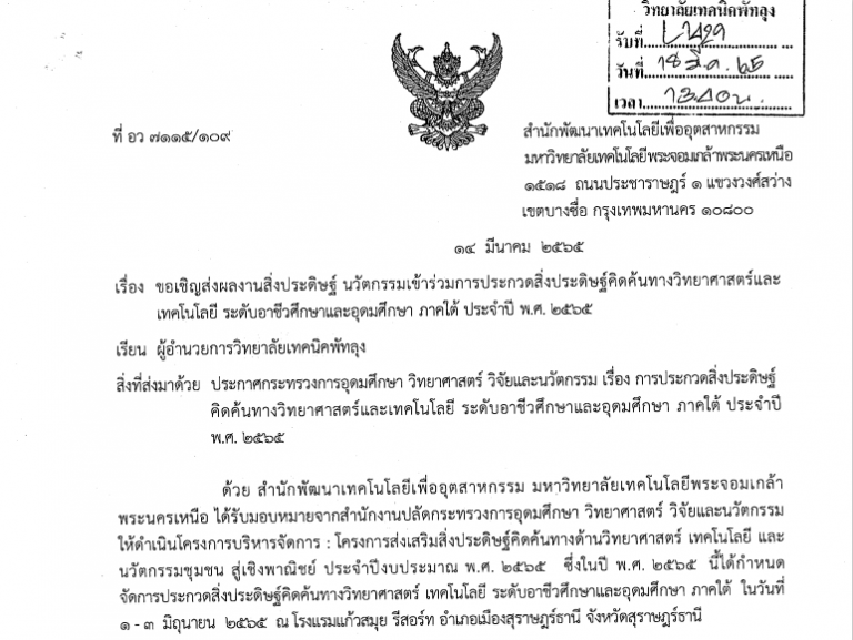 ขอเชิญส่งผลงานสิ่งประดิษฐ์ นวัตกรรมเข้าร่วมการประกวดสิ่งประดิษฐ์คิดค้นทางวิทยาศาสตร์และเทคโนโลยี ระดับอาชีวศึกษาและอุดมศึกษาภาคใต้ ประจำปี พ.ศ. 2565