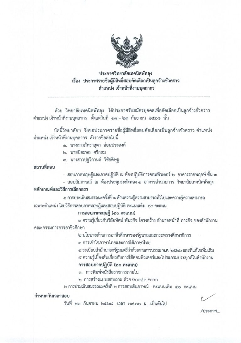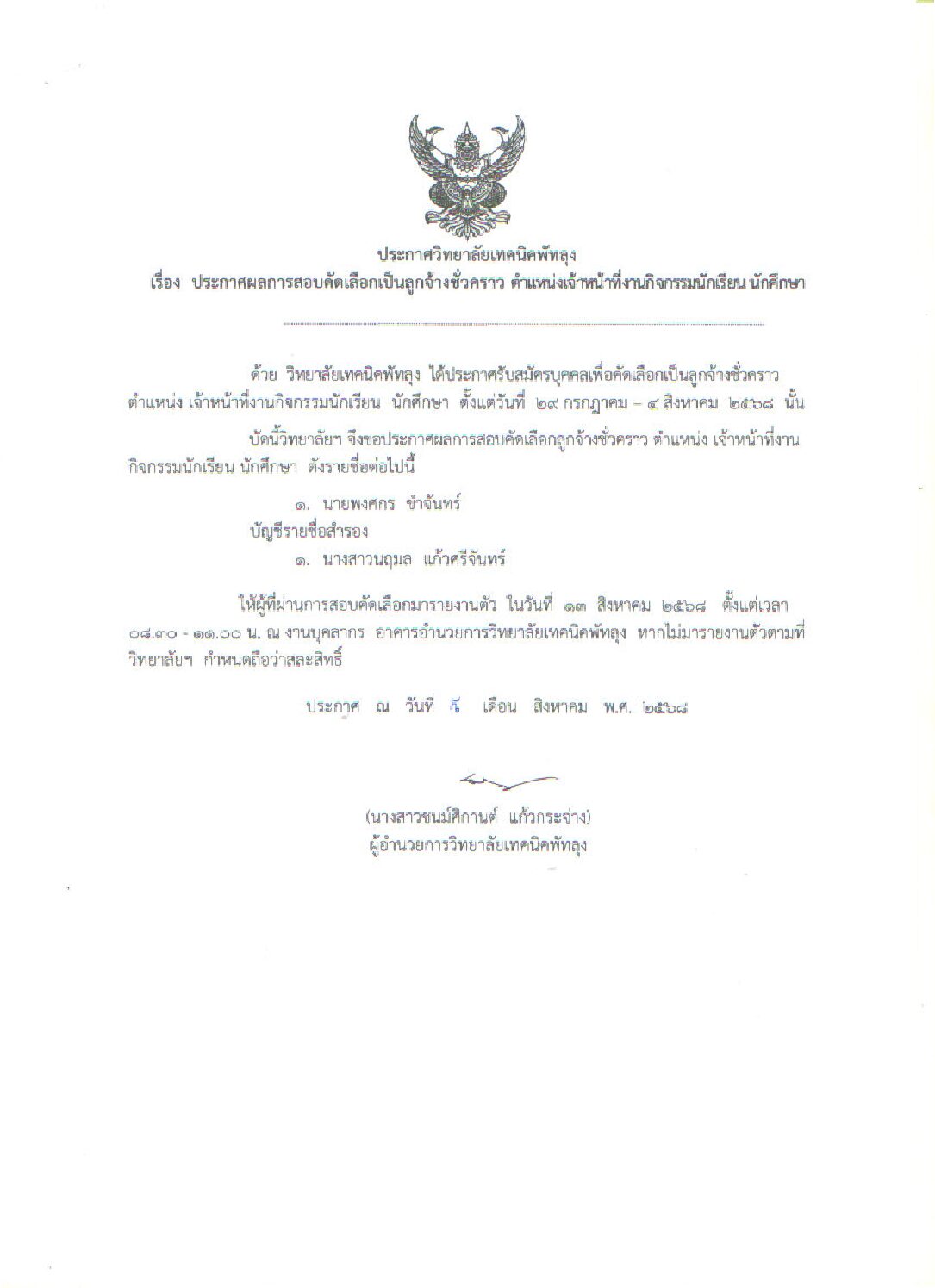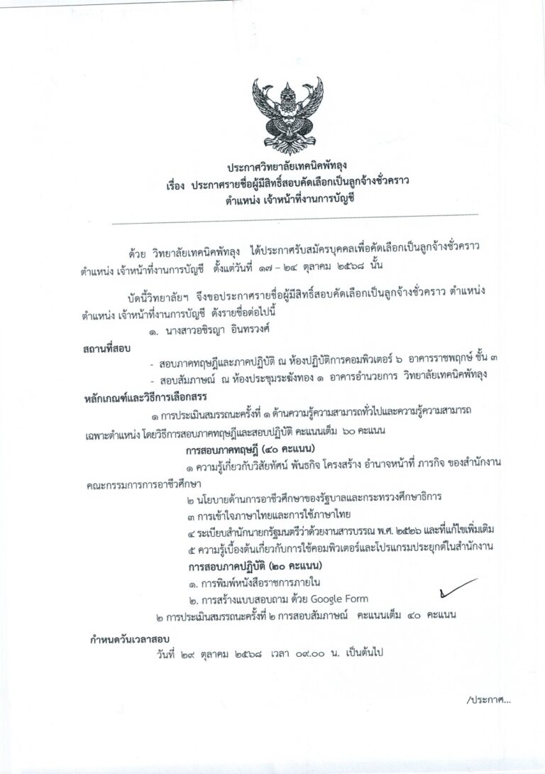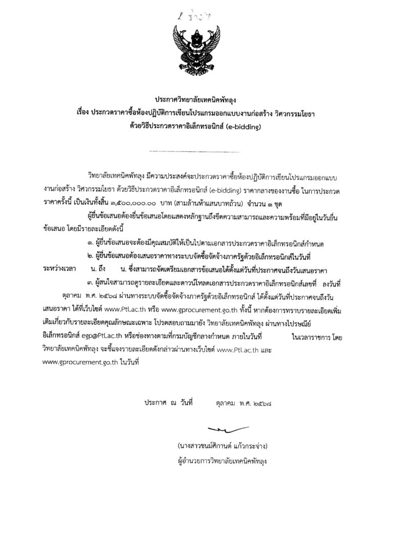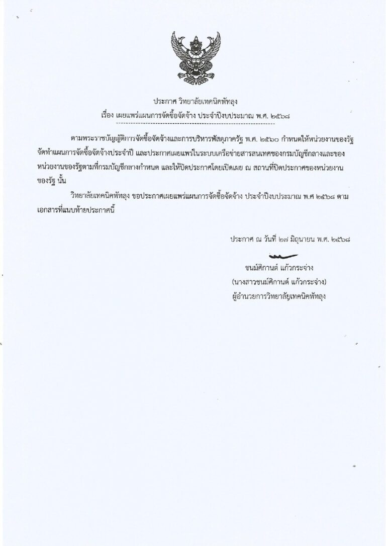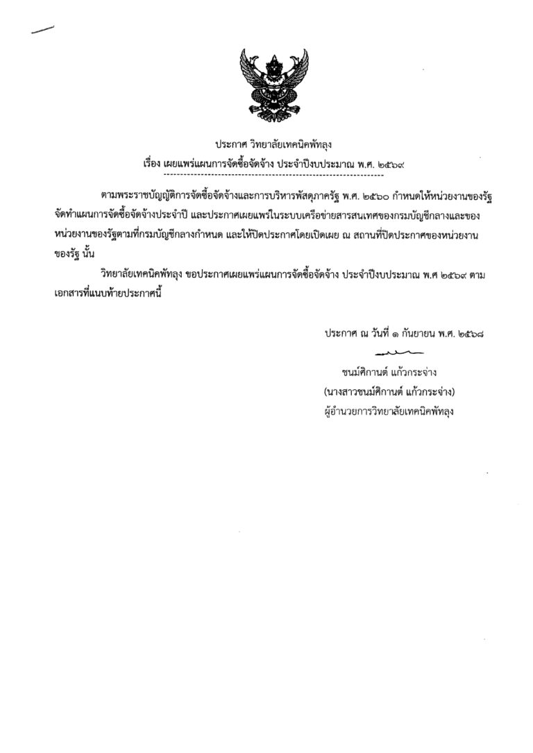 ประกาศวิทยาลัยเทคนิคพัทลุง เรื่อง เผยแพร่แผนการจัดซื้อจัดจ้าง ประจำปีงบประมาณ พ.ศ. 2568