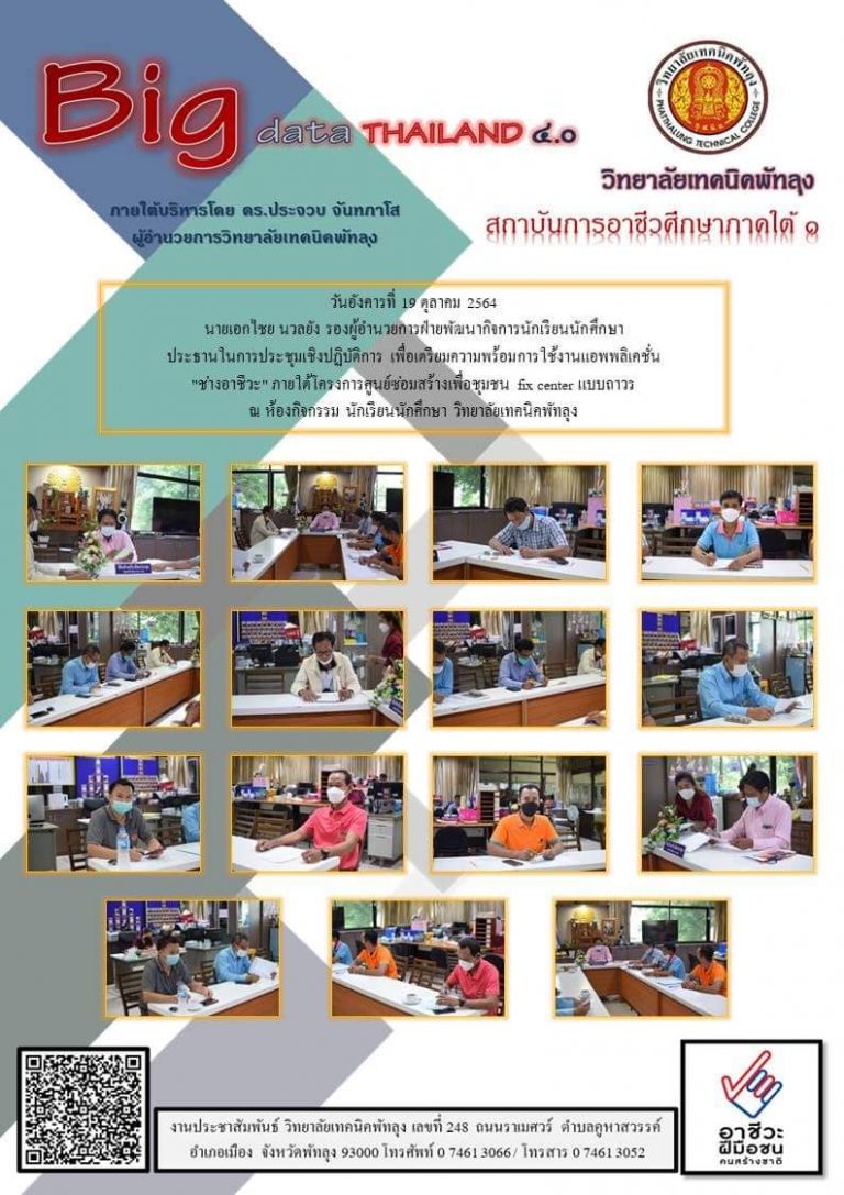 📣📣ประชาสัมพันธ์วิทยาลัยเทคนิคพัทลุงวันพุธที่ 20 ตุลาคม 2564ดร.ประจวบ จันทภาโส ผู้อำนวยการวิทยาลัยเทคนิคพัทลุงร่วมงานการเปิดใช้แอปพลิเคชันช่างอาชีวะ (ช่างพันธุ์ R อาชีวะซ่อมทั่วไทย)และ ขึ้นรับโล่ รางวัล ศูนย์ซ่อมสร้างเพื่อชุมชน ( fixit center ) แบบถาวร ระดับชาติโดยมี นางสาวตรีนุช เทียนทอง รัฐมนตรีว่าการกระทรวงศึกษาธิการ เป็นประธานในพิธีณ วิทยาลัยเทคนิคปทุมธานี