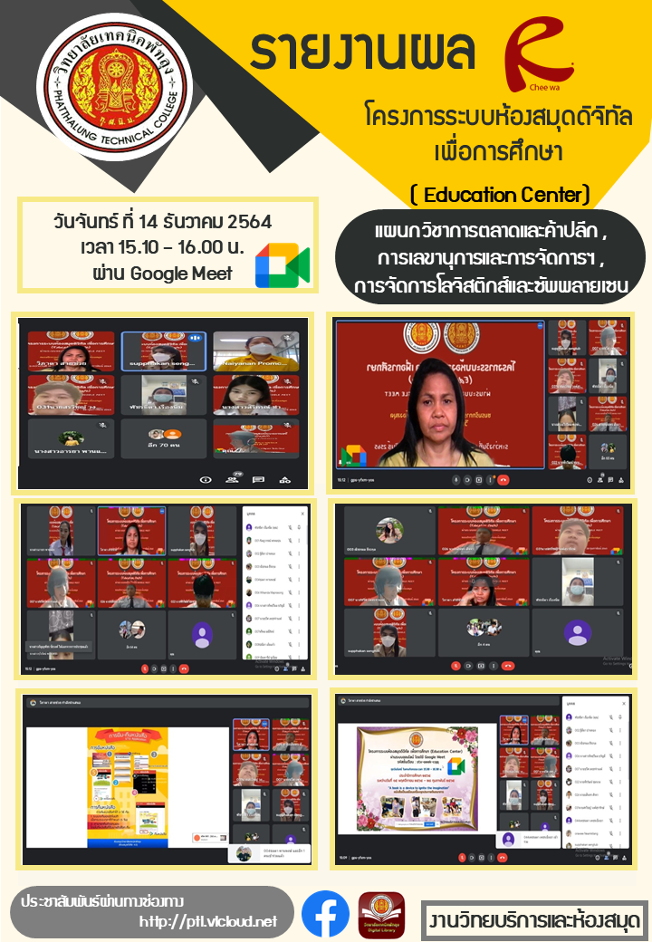 ในวันที่ 13 ธันวาคม 2564 งานวิทยบริการและห้องสมุด ขอรายงานผลการดำเนินโครงการระบบห้องสมุดดิจิทัล เพื่อการศึกษา ( Education) อบรมโครงการฯให้แก่ นักศึกษา ระดับชั้น ปวส.1 แผนกวิชาการตลาดและค้าปลีก,การเลขานุการและการจัดการฯ,การจัดการโลจิสติกส์และซัพพลายเซน ขอขอบพระคุณ ครูสุรีย์ การะศรี หัวหน้าแผนกวิชาการตลาด,ครูพิมพ์นารา อนุสาร หัวหน้าแผนกการจัดการฯ และครูอุไรรัตน์ มิตรมุสิก หัวหน้าแผนกการจัดการโลจ