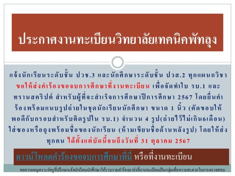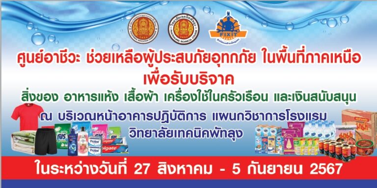 #ประชาสัมพันธ์วิทยาลัยเทคนิคพัทลุงศูนย์อาชีวะ ช่วยเหลือผู้ประสบภัยอุทกภัย ในพื้นที่ภาคเหนือ #เพื่อรับบริจาค- สิ่งของ อาหารแห้ง เสื้อผ้า เครื่องใช้ในครัวเรือน และเงินสนับสนุน#สามารถร่วมบริจาคได้ ณ บริเวณหน้าอาคารปฏิบัติการ แผนกวิชาการโรงแรม วิทยาลัยเทคนิคพัทลุง ระหว่างวันที่ 27 สิงหาคม - 5 กันยายน 2567