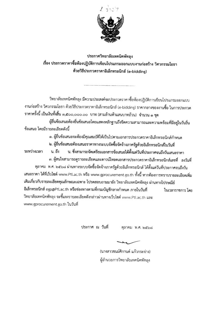 ประกาศวิทยาลัยเทคนิคพัทลุง เรื่อง ประกวดราคาซื้อห้องปฏิบัติการเขียนโปรแกรมออกแบบงานก่อสร้าง วิศวกรรมโยธา ด้วยวิธีประกวดราคาอิเล็กทรอนิกส์ (e-bidding)