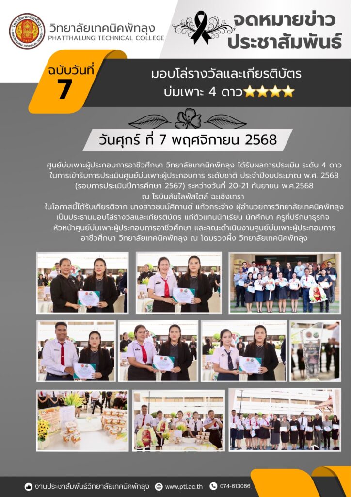 ⭐️มอบโล่รางวัลและเกียรติบัตร บ่มเพาะ 4 ดาววันศุกร์ ที่ 7 พฤศจิกายน 2568 ✨ศูนย์บ่มเพาะผู้ประกอบการอาชีวศึกษา วิทยาลัยเทคนิคพัทลุง ได้รับผลการประเมิน ระดับ 4 ดาว ⭐️⭐️⭐️⭐️ ในการเข้ารับการประเมินศูนย์บ่มเพาะผู้ประกอบการ ระดับชาติ ประจำปีงบประมาณ พ.ศ. 2568 (รอบการประเมินปีการศึกษา 2567) ระหว่างวันที่ 20-21 กันยายน พ.ศ.2568 ณ โรบินสันไลฟ์สไตล์ ฉะเชิงเทรา 📍ในโอกาสนี้ได้รับเกียรติจาก นางสาวชนม์ศิกานต์ แก้วกระจ่าง ผู้อำนวยการวิทยาลัยเทคนิคพัทลุง เป็นประธานมอบโล่รางวัลและเกียรติบัตร แก่ตัวแทนนักเรียน นักศึกษา ครูที่ปรึกษาธุรกิจ หัวหน้าศูนย์บ่มเพาะผู้ประกอบการอาชีวศึกษา และคณะดำเนินงานศูนย์บ่มเพาะผู้ประกอบการอาชีวศึกษา วิทยาลัยเทคนิคพัทลุง ณ โดมรวงผึ้ง วิทยาลัยเทคนิคพัทลุง