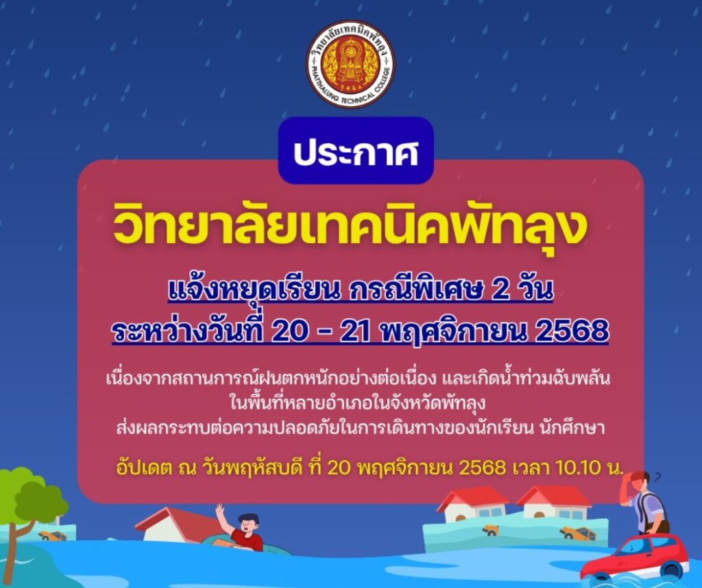 ประกาศ วิทยาลัยเทคนิคพัทลุง แจ้งหยุดเรียนกรณีพิเศษ 2 วัน ระหว่างวันที่ 20-21 พฤศจิกายน 2568 ข่าวครู-อาจารย์และบุคลากรทางการศึกษา ข่าวนักเรียนนักศึกษา ข่าววิทยาลัย 20 พ.ย. 2025 9 share tweet share ประกาศวิทยาลัยเทคนิคพัทลุง-การปิดสถานศึกษาดาวน์โหลด