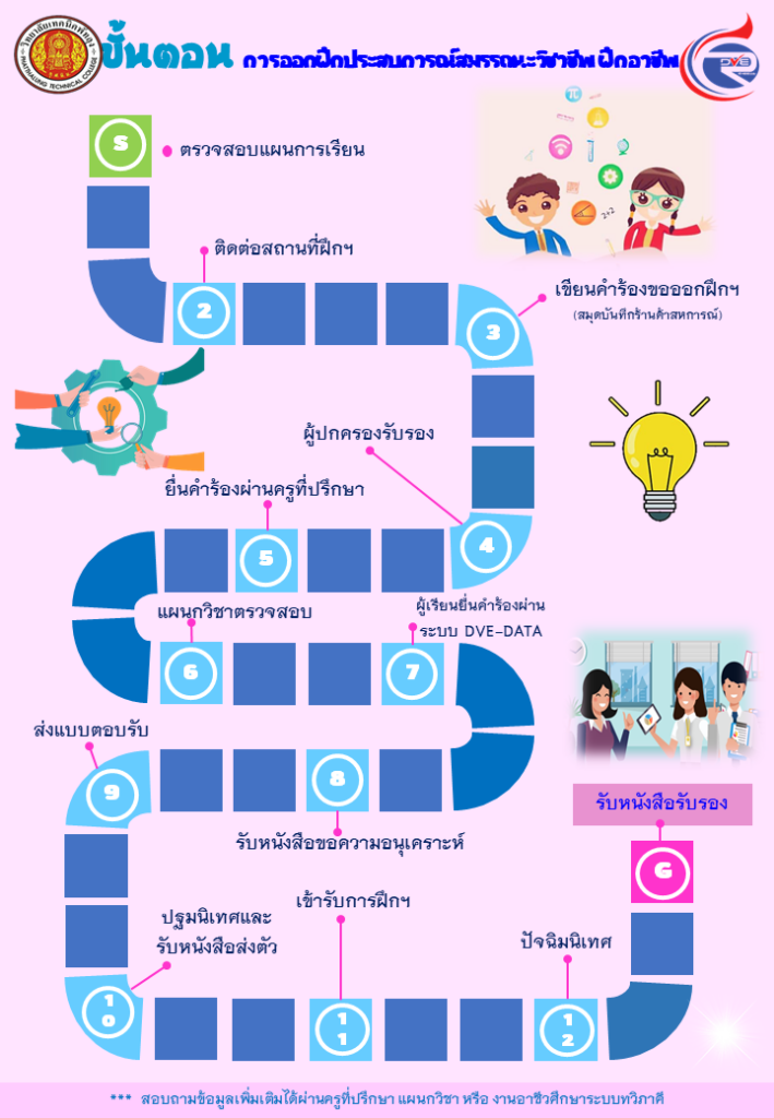 งานอาชีวศึกษาระบบทวิภาคี แจ้งนักเรียน นักศึกษายื่นคำร้องขอออกฝึกประสบการณ์สมรรถนะวิชาชีพ ฝึกอาชีพ ในสถานประกอบการ ภาคเรียนที่ 1 ปีการศึกษา 2569 ผ่านระบบ DVE DATA ระหว่างวันที่ 1-12 ธันวาคม 2568 ข่าวนักเรียนนักศึกษา ข่าววิทยาลัย งานอาชีวศึกษาระบบทวิภาคี 02 ธ.ค. 2025 15 share tweet share https://dve.cm.in.th/?mode=login คู่มือการใช้งานสำหรับผู้เรียนดาวน์โหลด