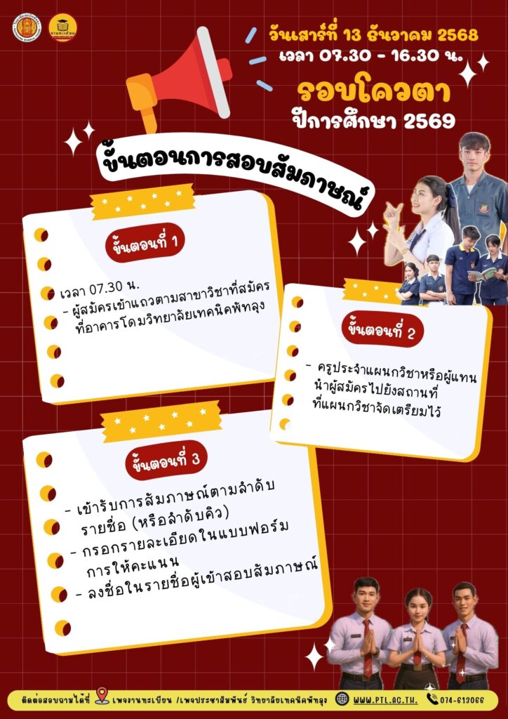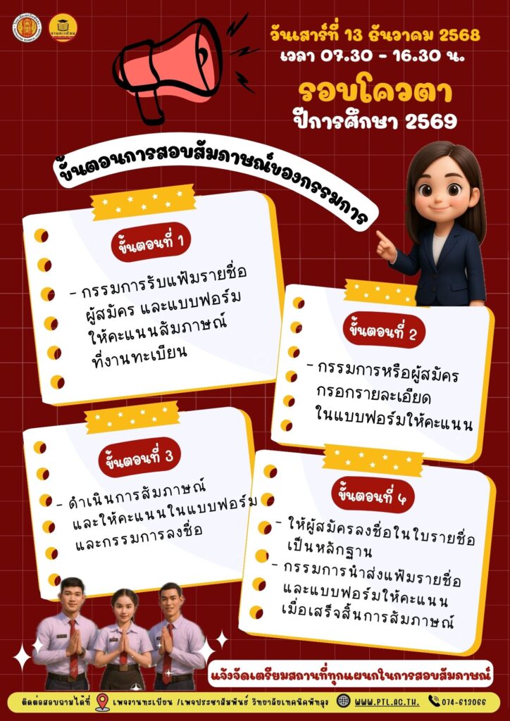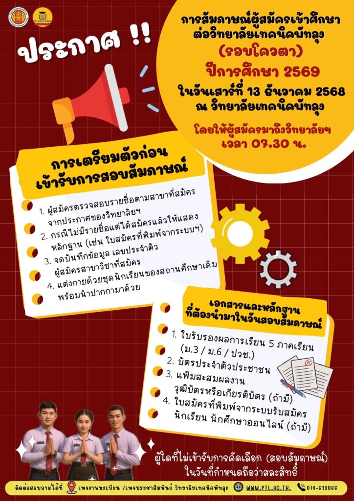 วันเสาร์ที่ 13 ธันวาคม 2568 นี้!!! รอบสอบสัมภาษณ์รอบโควตา ปีการศึกษา 2569อ่านรายละเอียดเพิ่มเติมด้านล่างนี้ได้เลยยยย![]()