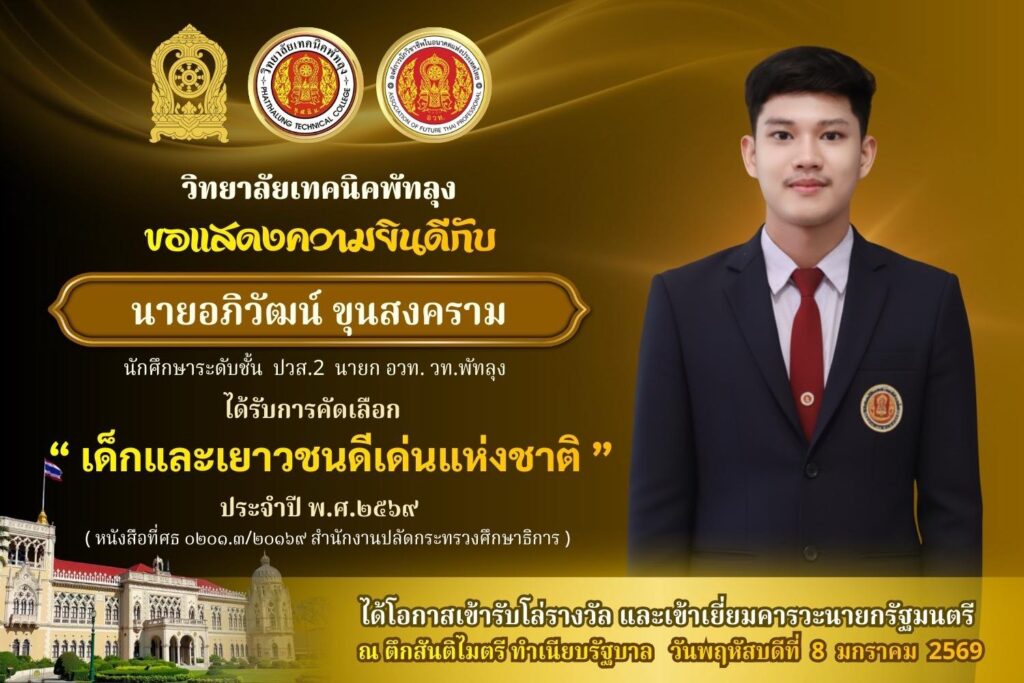 วิทยาลัยเทคนิคพัทลุง…ขอแสดงความยินดีกับ…นายอภิวัฒน์ ขุนสงคราม นักศึกษาชั้น ปวส.2 ประธานแผนกวิชาเทคโนโลยีธุรกิจดิจิทัล และนายกองค์การนักวิชาชีพในอนาคตแห่งประเทศไทย วิทยาลัยเทคนิคพัทลุง
