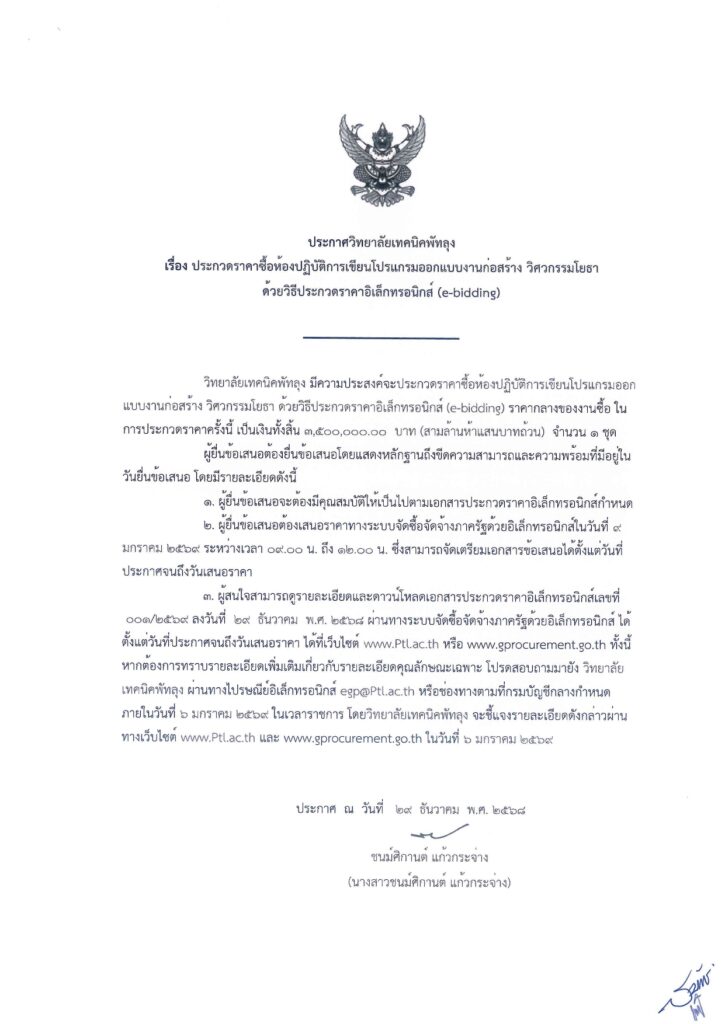 ประกาศวิทยาลัยเทคนิคพัทลุง เรื่องประกวดราคาซื้อห้องปฏิบัติการเขียนโปรแกรมออกแบบงานก่อสร้าง วิศวกรรมโยธา ด้วยวิธีประกวดราคาอิเล็กทรอนิกส์ (e-bidding)