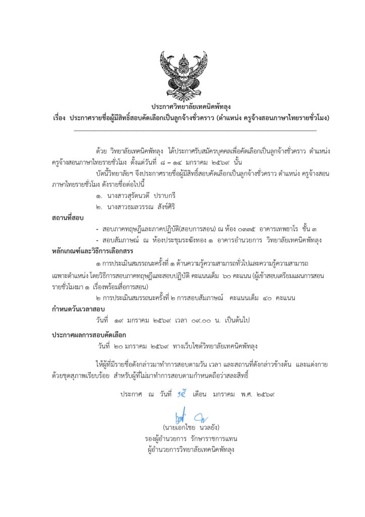 ประกาศรายชื่อผู้มีสิทธิ์สอบคัดเลือกเป็นลูกจ้างชั่วคราว (ตำแหน่ง ครูจ้างสอนภาษาไทยรายชั่วโมง) ข่าวงานบุคลากร 15 ม.ค. 2026 12 share tweet share ประกาศรายชื่อผู้มีสิทธิ์สอบครูจ้างสอนรายชั่วโมง-1ดาวน์โหลด