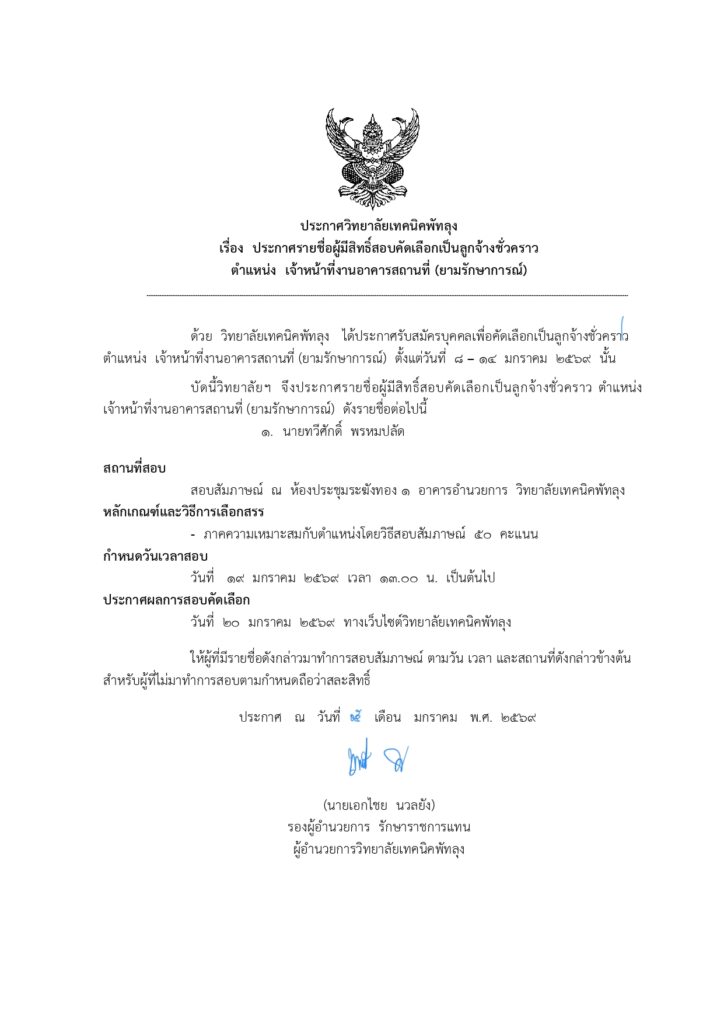 ประกาศรายชื่อผู้มีสิทธิ์สอบคัดเลือกเป็นลูกจ้างชั่วคราว ตำแหน่ง เจ้าหน้าที่งานอาคารสถานที่ (ยามรักษาการณ์) ข่าวงานบุคลากร 15 ม.ค. 2026 11 share tweet share ประกาศรายชื่อผู้มีสิทธิ์สอบยามรักษาการณ์ดาวน์โหลด