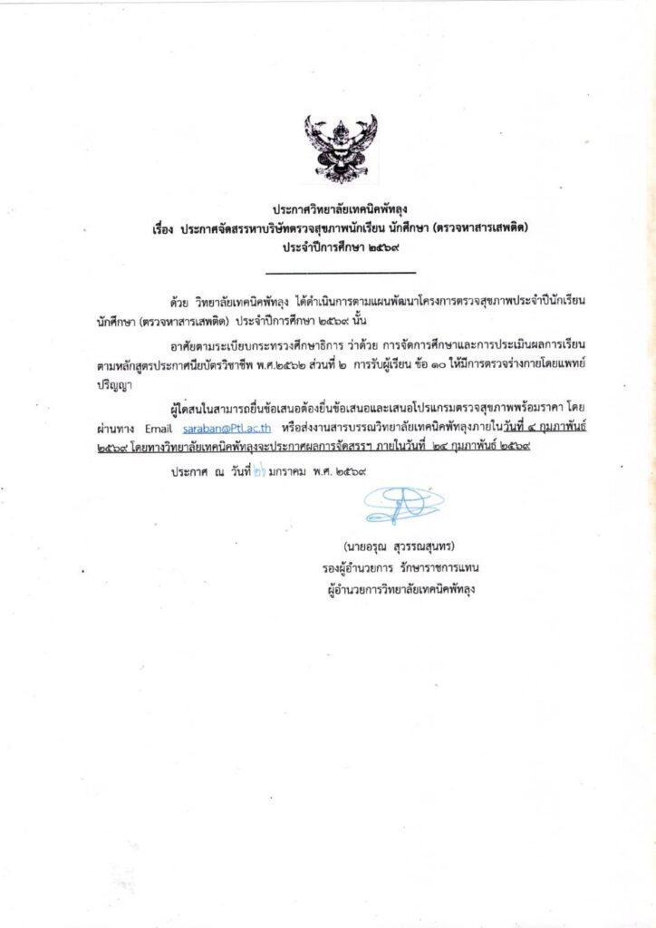 ประกาศวิทยาลัยเทคนิคพัทลุง เรื่อง ประกาศจัดสรรหาบริษัทตรวจสุขภาพนักเรียน นักศึกษา (ตรวจหาสารเสพติด) ประจำปีการศึกษา 2569 ข่าววิทยาลัย 04 ก.พ. 2026 11 share tweet share