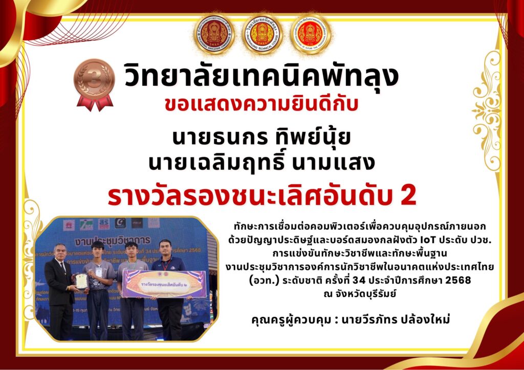 วิทยาลัยเทคนิคพัทลุง ขอแสดงความยินดีกับ🎉🎉✨นายธนกร ทิพย์นุ้ย✨นายเฉลิมฤทธิ์ นามแสงได้รับรางวัลรองชนะเลิศอันดับ2👍การแข่งขันทักษะการเชื่อมต่อคอมพิวเตอร์เพื่อควบคุมอุปกรณ์ภายนอกด้วยปัญญาประดิษฐ์และบอร์ดสมองกลฝังตัว IoT ประดับ ปวช.📍งานประชุมวิชาการองค์การนักวิชาชีพในอนาคตแห่งประเทศไทย (อวท.) ระดับชาติ ครั้งที่ 34 ประจำปีการศึกษา 2568ณ จังหวัดบุรีรัมย์👨‍🏫คุณครูผู้ควบคุม : นายวีรภัทร ปล้องใหม่