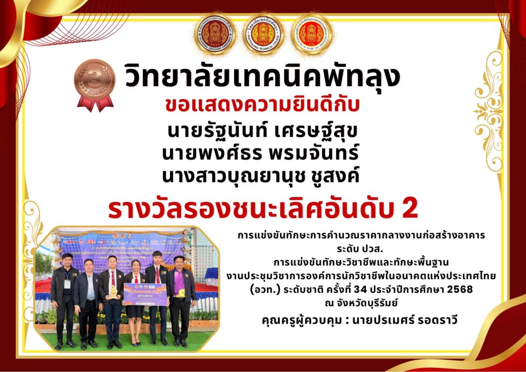 วิทยาลัยเทคนิคพัทลุง ขอแสดงความยินดีกับ🎉🎉✨นายรัฐนันท์ เศรษฐ์สุข ✨นายพงศ์ธร พรมจันทร์ ✨นางสาวบุณยานุช ชูสงค์ ได้รับรางวัลรองชนะเลิศอันดับ2👍การแข่งขันทักษะการคํานวณราคากลางงานก่อสร้างอาคาร ระดับ ปวส. 📍งานประชุมวิชาการองค์การนักวิชาชีพในอนาคตแห่งประเทศไทย (อวท.) ระดับชาติ ครั้งที่ 34 ประจำปีการศึกษา 2568ณ จังหวัดบุรีรัมย์👨‍🏫คุณครูผู้ควบคุม : นายปรเมศร์ รอดราวี