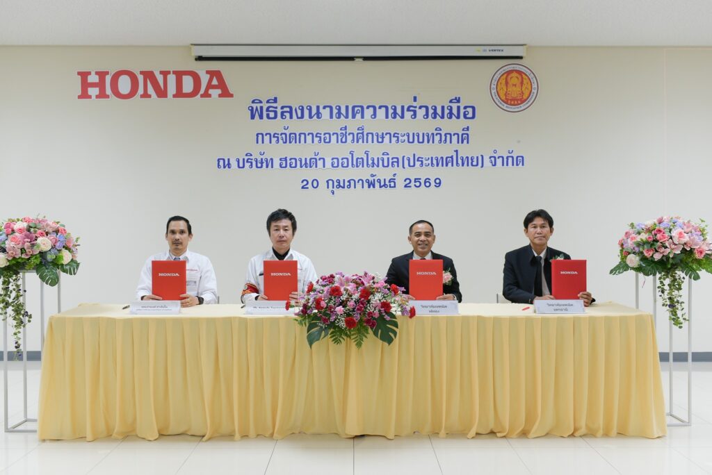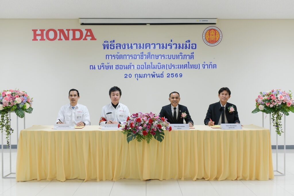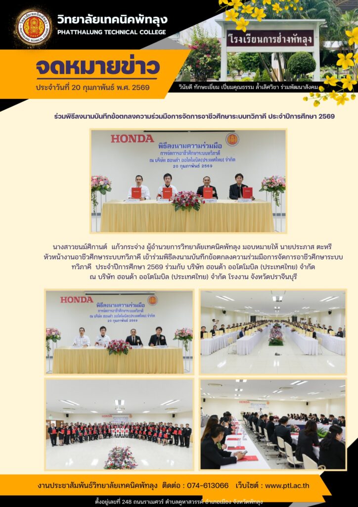 วันศุกร์ ที่ 20 กุมภาพันธ์ 2569 ✍️นางสาวชนม์ศิกานต์ แก้วกระจ่าง ผู้อำนวยการวิทยาลัยเทคนิคพัทลุง มอบหมายให้ นายประภาส ตะหรี หัวหน้างานอาชีวศึกษาระบบทวิภาคี เข้าร่วมพิธีลงนามบันทึกข้อตกลงความร่วมมือการจัดการอาชีวศึกษาระบบทวิภาคี ประจำปีการศึกษา 2569 ร่วมกับ บริษัท ฮอนด้า ออโตโมบิล (ประเทศไทย) จำกัด ณ บริษัท ฮอนด้า ออโตโมบิล (ประเทศไทย) จำกัด โรงงาน จังหวัดปราจีนบุรี