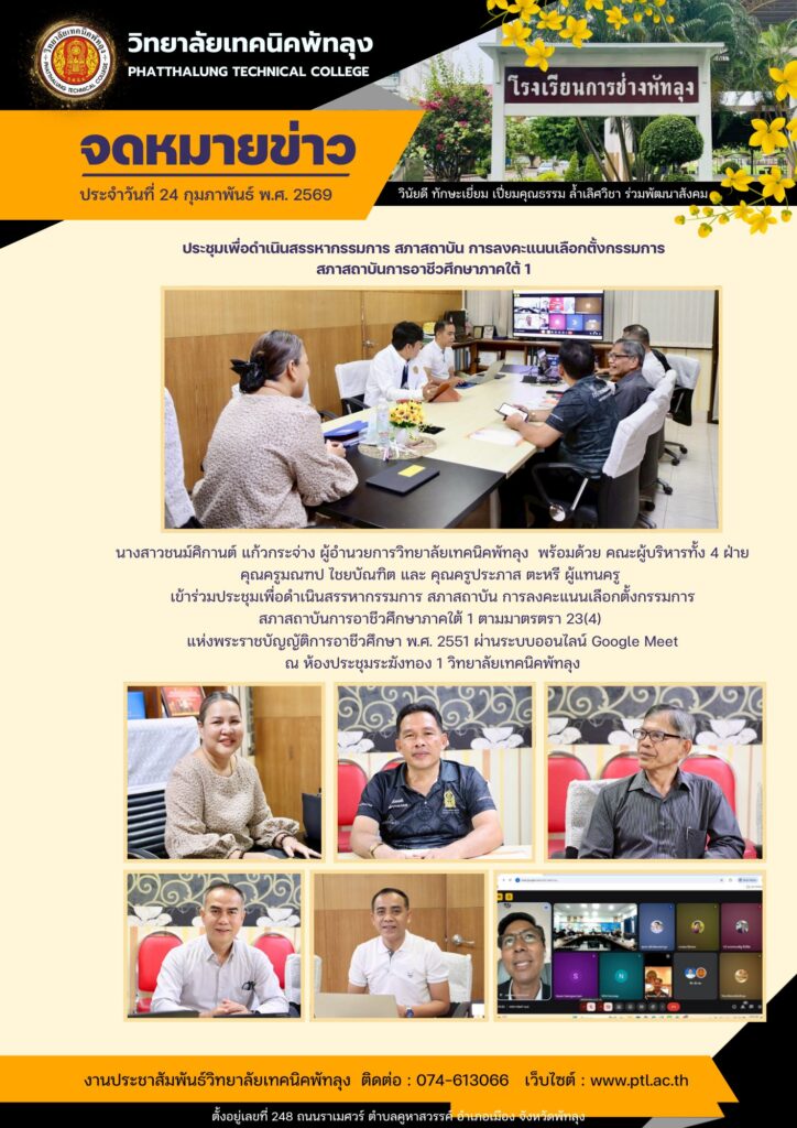 ประชุมเพื่อดำเนินสรรหากรรมการ สภาสถาบัน การลงคะแนนเลือกตั้งกรรมการสภาสถาบันการอาชีวศึกษาภาคใต้ 1วันอังคาร ที่ 24 กุมภาพันธ์ 2569 ✍️นางสาวชนม์ศิกานต์ แก้วกระจ่าง ผู้อำนวยการวิทยาลัยเทคนิคพัทลุง พร้อมด้วย คณะผู้บริหารทั้ง 4 ฝ่าย คุณครูมณฑป ไชยบัณฑิต และ คุณครูประภาส ตะหรี ผู้แทนครู เข้าร่วมประชุมเพื่อดำเนินสรรหากรรมการ สภาสถาบัน การลงคะแนนเลือกตั้งกรรมการสภาสถาบันการอาชีวศึกษาภาคใต้ 1 ตามมาตรตรา 23(4) แห่งพระราชบัญญัติการอาชีวศึกษา พ.ศ. 2551 ผ่านระบบออนไลน์ Google Meetณ ห้องประชุมระฆังทอง 1 วิทยาลัยเทคนิคพัทลุง