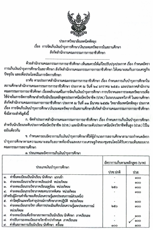 การจัดเก็บเงินบำรุงการศึกษา/เงินระดมทรัพยากรในสถานศึกษา สังกัดสำนักงานคณะกรรมการการอาชีวศึกษา ข้อมูลเผยแพร่งานบัญชี 05 มี.ค. 2026 4 share tweet share ประกาศวิทยาลัยเทคนิคปีการศึกษา-2569ดาวน์โหลด