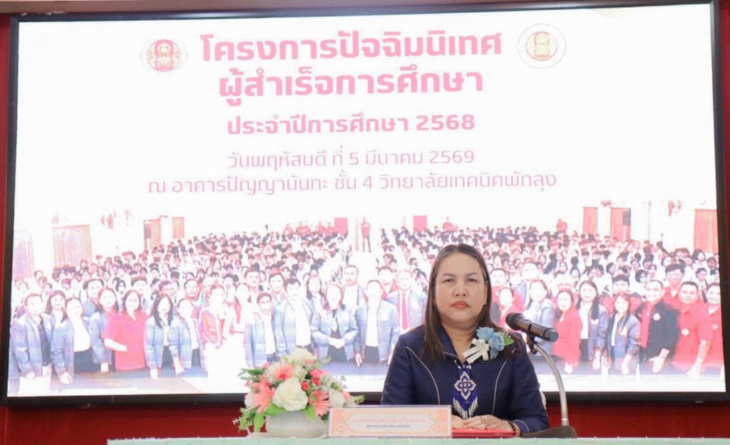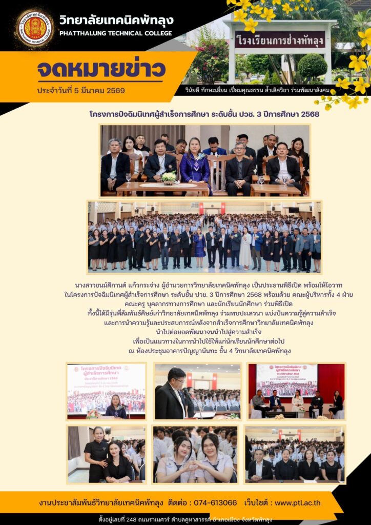 ✍️โครงการปัจฉิมนิเทศผู้สำเร็จการศึกษา ระดับชั้น ปวช. 3 ปีการศึกษา 2568วันพฤหัสบดี ที่ 5 มีนาคม 2569 ✨นางสาวชนม์ศิกานต์ แก้วกระจ่าง ผู้อำนวยการวิทยาลัยเทคนิคพัทลุง เป็นประธานพิธีเปิด พร้อมให้โอวาท ในโครงการปัจฉิมนิเทศผู้สำเร็จการศึกษา ระดับชั้น ปวช. 3 ปีการศึกษา 2568 พร้อมด้วย คณะผู้บริหารทั้ง 4 ฝ่าย คณะครู บุคลากรทางการศึกษา และนักเรียนนักศึกษา ร่วมพิธีเปิด 📍ทั้งนี้ได้มีรุ่นพี่สัมพันธ์ศิษย์เก่าวิทยาลัยเทคนิคพัทลุง ร่วมพบปะเสวนา แบ่งปันความรู้สู่ความสำเร็จ และการนำความรู้และประสบการณ์หลังจากสำเร็จการศึกษาวิทยาลัยเทคนิคพัทลุง นำไปต่อยอดพัฒนาจนนำไปสู่ความสำเร็จ เพื่อเป็นแนวทางในการนำไปใช้ให้แก่นักเรียนนักศึกษาต่อไป ณ ห้องประชุมอาคารปัญญานันทะ ชั้น 4 วิทยาลัยเทคนิคพัทลุงดำเนินงานโดย : งานแนะแนวอาชีพและจัดหางาน วิทยาลัยเทคนิคพัทลุง