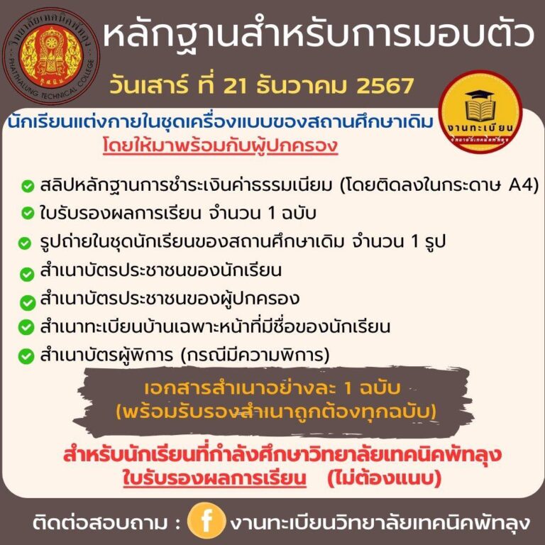 ประกาศจากงานทะเบียน วิทยาลัยเทคนิคพัทลุง เรื่องประกาศรายชื่อผู้ผ่านการคัดเลือกเข้าศึกษาต่อ ระดับชั้น ปวช. (ประเภทโควตา) ประจำปีการศึกษา 2568