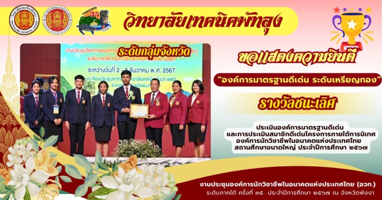 รางวัลชนะเลิศ องค์การมาตรฐานดีเด่น ระดับเหรียญทอง ระดับกลุ่มจังหวัด สถานศึกษาขนาดใหญ่ ประจำปีการศึกษา 2567