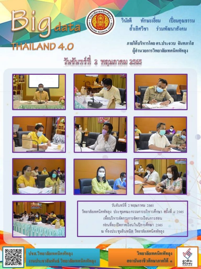 ดร.ประจวบ จันทภาโส ผู้อำนวยการวิทยาลัยเทคนิคพัทลุง เป็นประธานประชุมคณะกรรมการบริหารสถานศึกษา ครั้งที่ 4/2565