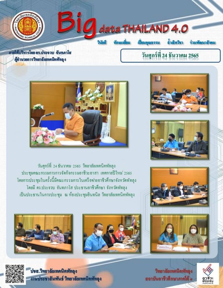 ดร.ประจวบ จันทภาโส ผู้อำนวยการวิทยาลัยเทคนิคพัทลุง ประธานอาชีวศึกษาจังหวัดพัทลุง ประชุมคณะกรรมการจัดกิจกรรมอาชีวะอาสา เทศกาลปีใหม่ 2565