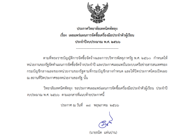 ประกาศวิทยาลัยเทคนิคพัทลุง เรื่องเผยแพร่แผนการจัดซื้อเครื่องมือประจำตัวผู้เรียน ประจำปีงบประมาณ พ.ศ. 2566