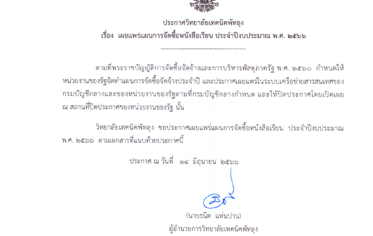 ประกาศวิทยาลัยเทคนิคพัทลุง เรื่อง เผยแพร่แผนการจัดซื้อหนังสือเรียน ประจำปีงบประมาณ พ.ศ. 2566