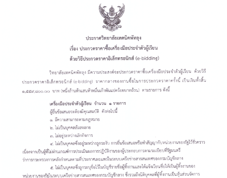 ประกาศวิทยาลัยเทคนิคพัทลุง เรื่อง ประกวดราคาซื้อเครื่องมือประจำตัวผู้เรียนด้วยวิธีประกวดราคาอิเล็กทรอนิกส์ (e-bidding)