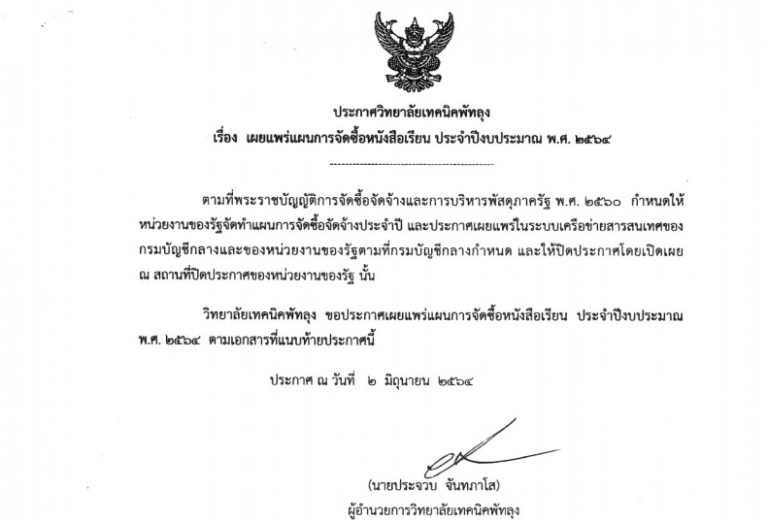 ประกาศ วิทยาลัยเทคนิคพัทลุง เรื่อง เผยแพร่แผนการจัดซื้อหนังสือเรียน ประจำปีงบประมาณ 2565