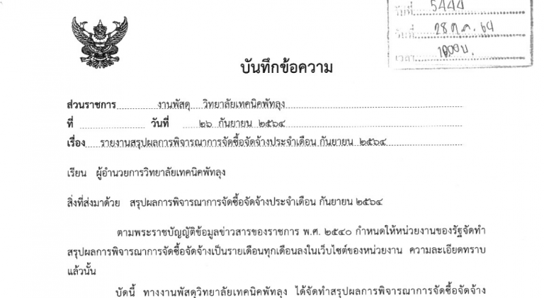 รายงานสรุปผลการพิจารณาการจัดซื้อจัดจ้างประจำเดือน กันยายน 2564