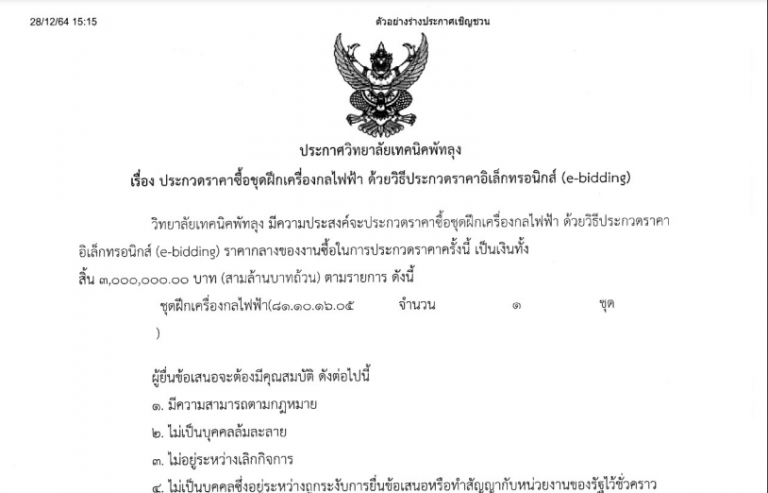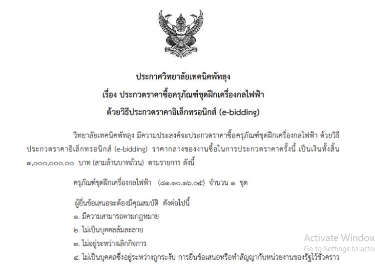 ประกาศวิทยาลัยเทคนิคพัทลุง เรื่อง ประกวดราคาซื้อครุภัณฑ์ชุดฝึกเครื่องกลไฟฟ้าด้วยวิธีประกวดราคาอิเล็กทรอนิกส์ (e-bidding)