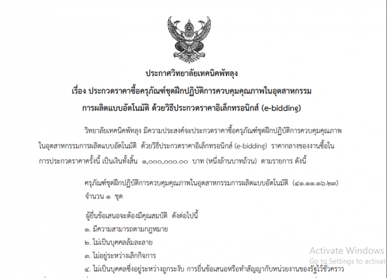 ประกาศวิทยาลัยเทคนิคพัทลุง เรื่อง ประกวดราคาซื้อครุภัณฑ์ชุดฝึกปฏิบัติการควบคุมคุณภาพในอุตสาหกรรมการผลิตแบบอัตโนมัติด้วยวิธีประกวดราคาอิเล็กทรอนิกส์ (e-bidding)