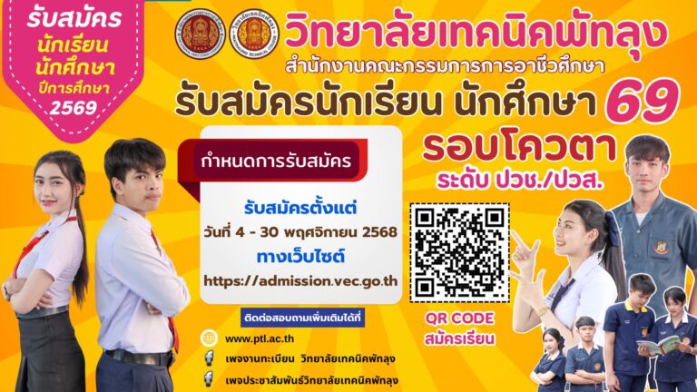 วิทยาลัยเทคนิคพัทลุง เปิดรับสมัครนักเรียนนักศึกษา (รอบโควตา) ประจำปีการศึกษา 2569