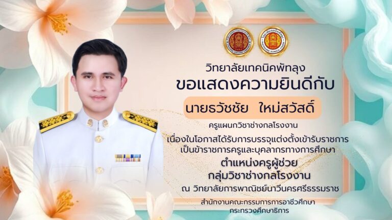 วิทยาลัยเทคนิคพัทลุง ขอแสดงความยินดีกับ นายธวัชชัย ใหม่สวัสดิ์ ครูแผนกวิชาช่างกลโรงงาน เนื่องในโอกาสได้รับการบรรจุแต่งตั้งเข้ารับราชการเป็นข้าราชการครูและบุคลากรทางการศึกษา ตำแหน่งครูผู้ช่วย กลุ่มวิชาช่างกลโรงงาน ณ วิทยาลัยการพาณิชย์นาวีนครศรีธรรมราช