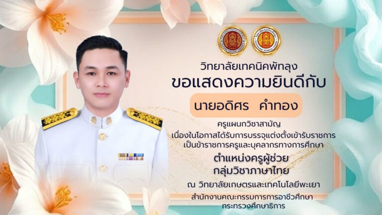 วิทยาลัยเทคนิคพัทลุง ขอแสดงความยินดีกับ นายอดิศร คำทอง ครูแผนกวิชาสามัญ เนื่องในโอกาสได้รับการบรรจุแต่งตั้งเข้ารับราชการเป็นข้าราชการเป็นข้าราชการครูและบุคลากรทางการศึกษา ตำแหน่งครูผู้ช่วย กลุ่มวิชาภาษาไทย ณ วิทยาลัยเกษตรและเทคโนโลยีพะเยา