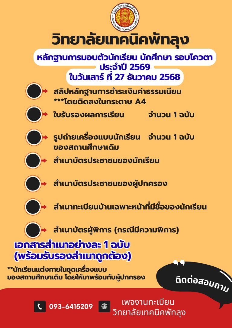 กำหนดการรายงานตัว มอบตัวเข้าศึกษาต่อวิทยาลัยเทคนิคพัทลุง (รอบโควตา) ปีการศึกษา 2569
