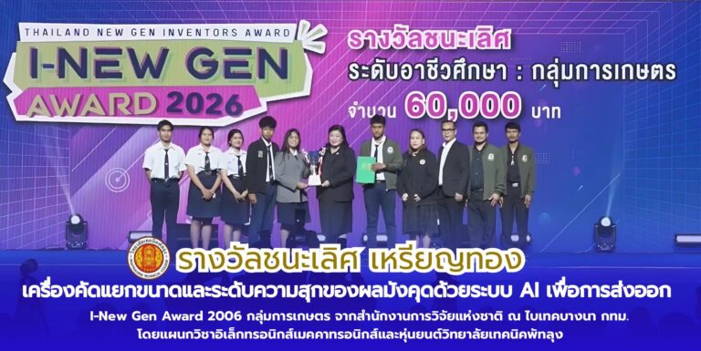 สุดยอดนักประดิษฐ์ วิทยาลัยเทคนิคพัทลุง คว้ารางวัลชนะเลิศ เหรียญทอง I-New Gen Award 2026 ผลงาน เครื่องคัดแยกขนาดและระดับความสุกของผลมังคุดด้วยระบบ AI เพื่อการส่งออก