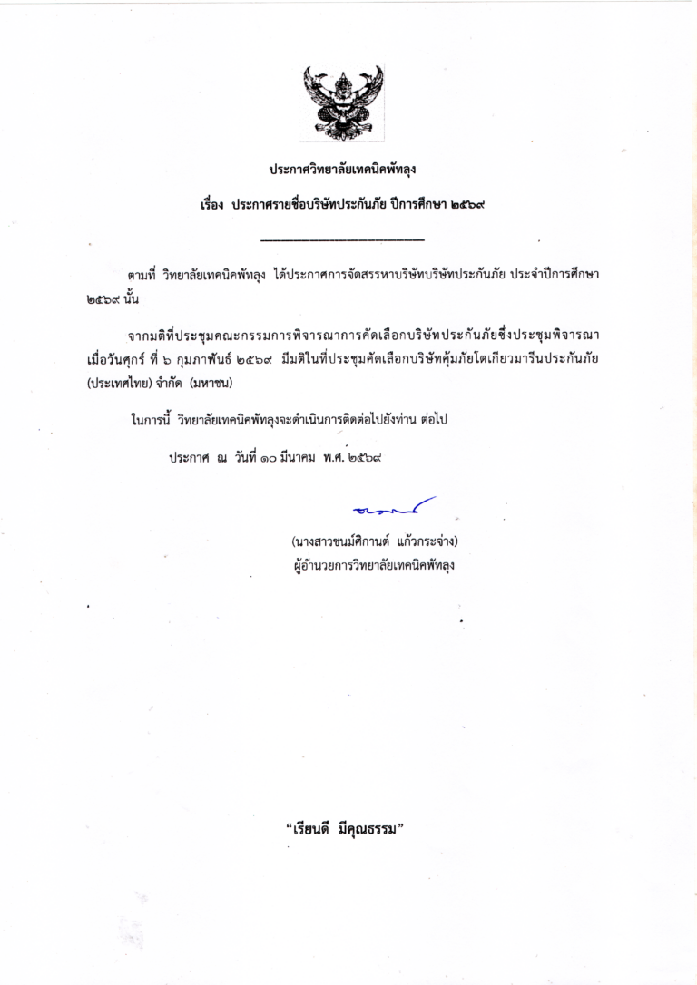 ประกาศวิทยาลัยเทคนิคพัทลุง เรื่อง ประกาศรายชื่อบริษัทประกันภัย ปีการศึกษา 2569
