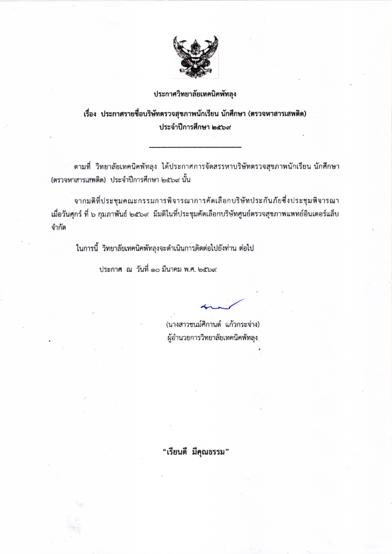 ประกาศวิทยาลัยเทคนิคพัทลุง เรื่อง ประกาศรายชื่อบริษัทตรวจสุขภาพนักเรียน นักศึกษา (ตรวจหาสารเสพติด) ประจำปีการศึกษา 2569