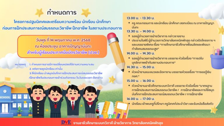 กำหนดการโครงการปฐมนิเทศและเตรียมความพร้อมนักเรียนนักศึกษาก่อนการฝึกประสบการณ์สมรรถนะวิชาชีพ ฝึกอาชีพ ในสถานประกอบการ ประจำภาคเรียนที่ 1 ปีการศึกษา 2568
