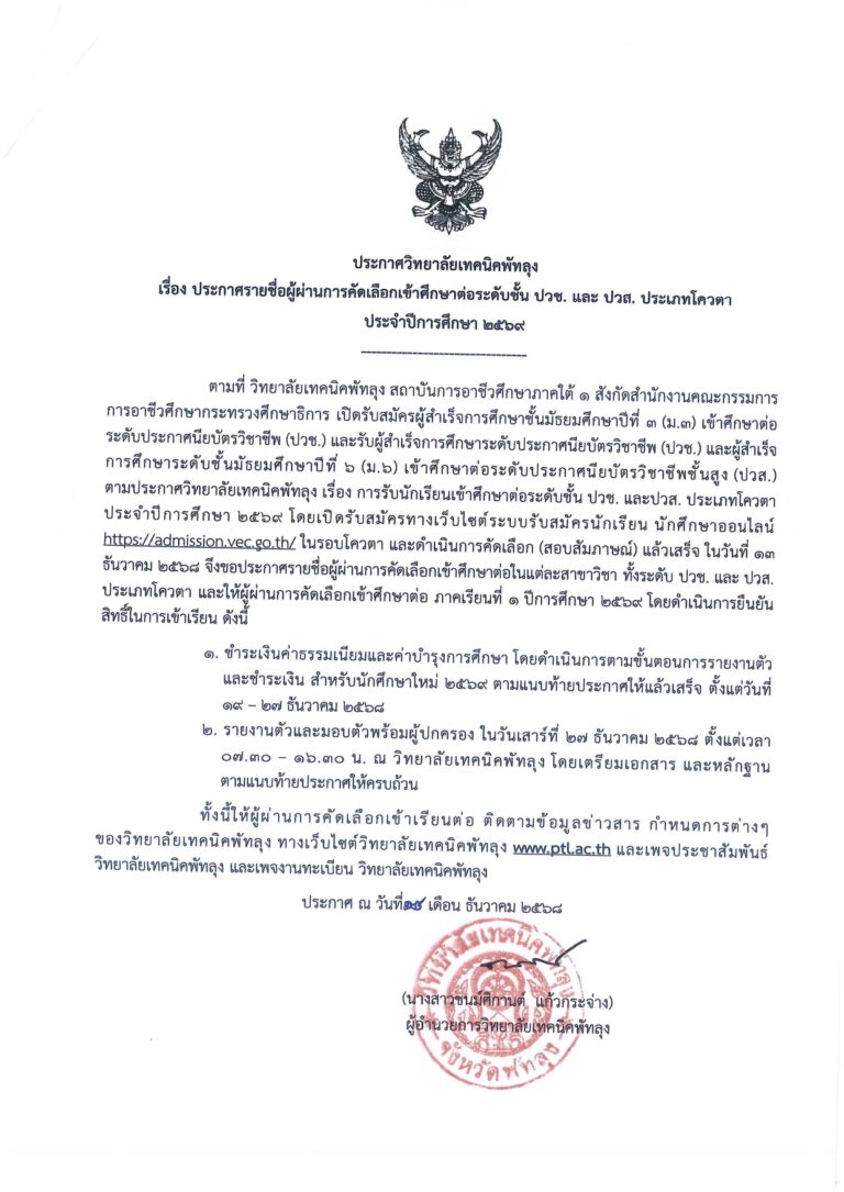 กำหนดการรายงานตัว มอบตัวเข้าศึกษาต่อวิทยาลัยเทคนิคพัทลุง (รอบโควตา) ปีการศึกษา 2569