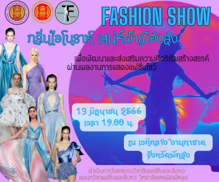 ประชาสัมพันธ์แผนกแฟชั่นและสิ่งทอ วิทยาลัยเทคนิคพัทลุง จัดแสดงแฟชั่นโชว์ “กลิ่นไอโนราห์ เสน่ห์ผ้าเมืองลุง” ฝีมือการออกแบบและตัดเย็บโดยนักเรียนนักศึกษาแผนกวิชาแฟชั่นและสิ่งทอ