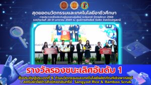 รางวัลรองชนะเลิศ อันดับ 1 สิ่งประดิษฐ์ประเภทที่ 6 ด้านนวัตกรรมและเทคโนโลยีผลิตภัณฑ์เชิงพาณิชย์ สครับผิวไผ่ข้าวสังข์หยดอินทรีย์ Sangyod Rice & Bamboo Scrub