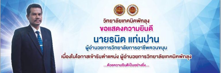วิทยาลัยเทคนิคพัทลุง ขอแสดงความยินดีต้อนรับ นายธนิต แท่นปาน เนื่องในโอกาสเข้ารับตำแหน่ง ผู้อำนวยการวิทยาลัยเทคนิคพัทลุง ด้วยความยินดีเป็นอย่างยิ่ง