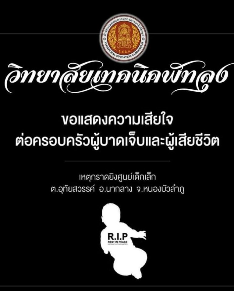 ในนามของคณะผู้บริหารสถานศึกษา ข้าราชการครู บุคลากรทางการศึกษาและนักเรียน นักศึกษาสังกัดวิทยาลัยเทคนิคพัทลุง ขอแสดงความเสียใจต่อครอบครัวของผู้บาดเจ็บและผู้เสียชีวิต เหตุกราดยิงศูนย์เด็กเล็ก ต.อุทัยสวรรค์ อ.นากลาง จ.หนองบัวลำภู