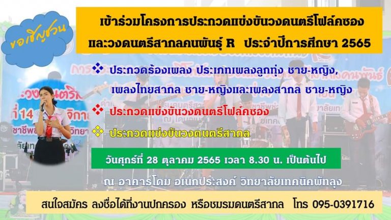 ขอเชิญชวน นักเรียน นักศึกษา ที่สนใจ เข้าร่วมโครงการประกวดแข่งขันวงดนตรีโฟล์คซอง และวงดนตรีสากลคนพันธุ์ R ประจำปีการศึกษา 2565